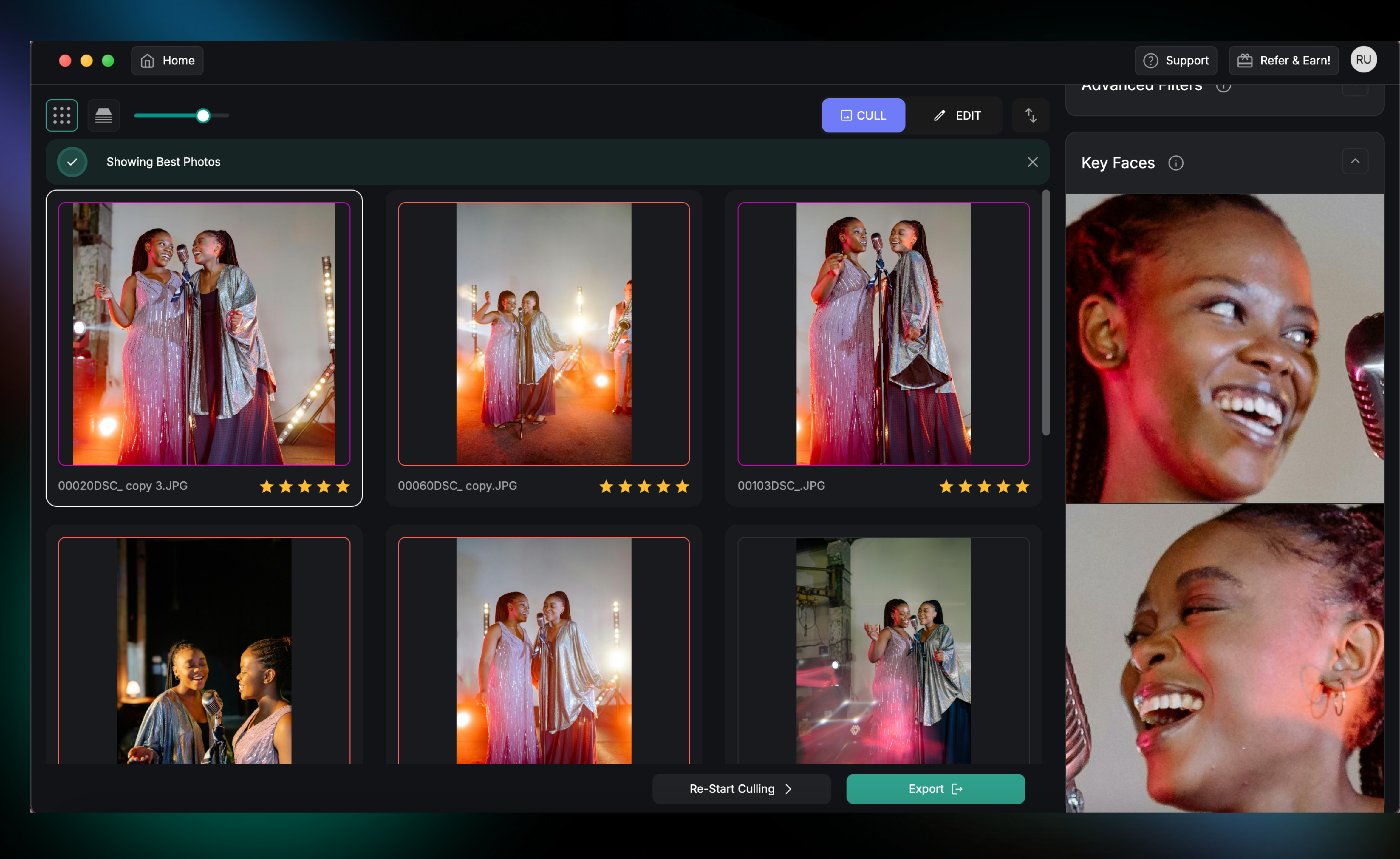 A unified culling platform changes this by combining sharpness detection, duplicate removal, facial recognition, and export into one process. Time saved in one step doesn't get lost in another.